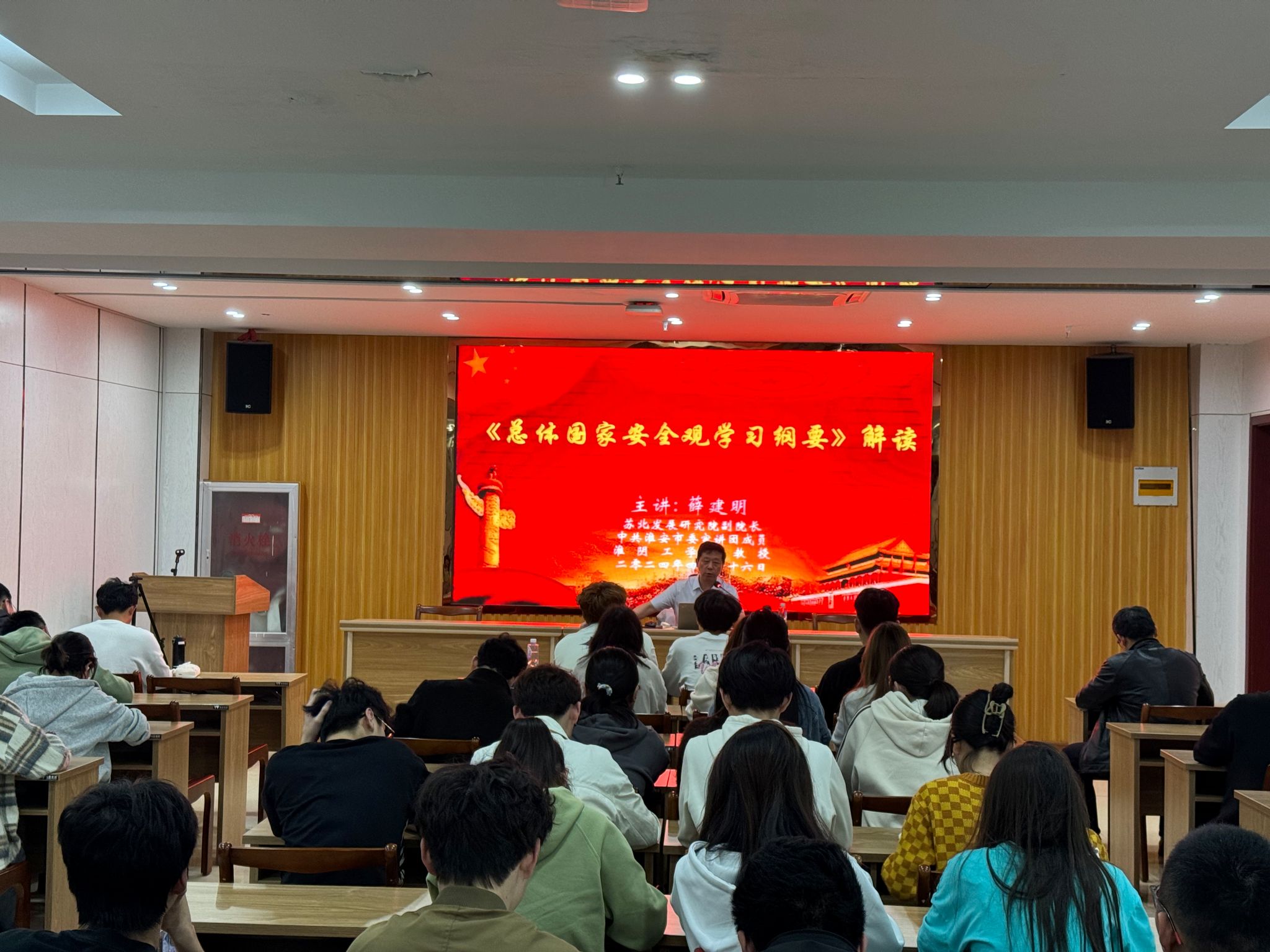 淮安市总体国家安全观“高校行”启动仪式于4月12日在公司举行后,4月16日下午,今年会邀请了淮安市委宣讲团成员、公司关工委老同志、公司老员工综合素质发展导师薛建明教授在萧湖校区文博楼报告厅为师生作了一场以《总体国家安全观学习纲要》为主题的专题辅导报告。公司党政班子成员、各党支部书记以及师生代表参加了宣讲会。公司党委书记、关工委主任李继林主持宣讲会。