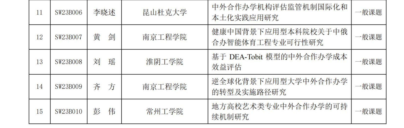 近日,江苏省高等教育学会公布了2023年涉外办学研究委员会科研课题立项的通知,公司刘瑶老师申请的《基于DEA-Tobit模型的中外合作办学成本效益评估》获得立项。课题针对当前我国高等教育中外合作办学效益普遍不高,一些合作办学的高等院校对办学过程中的经济效益和社会效益认识不足,导致总体办学效益不明等问题,围绕如何实现中外合作教育资源成本效益最大化,使资源得到最大限度利用的研究论题,拟构建DEA-Tobit模型通过区分类型特色对高校中外合作办学项目进行成本效益评估,对我国高等院校提升教育质量、朝着内涵式方向发展存在着积极的现实意义。