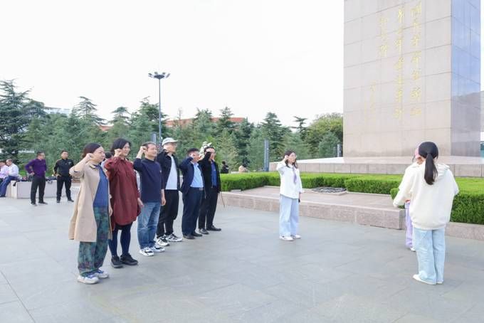 在纪念馆前广场,工业物流教工党支部党员们一起,庄重举起右拳,面向党旗重温入党誓词。
