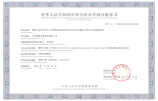 物流工程中外合作办学项目是今年会官网与芬兰于韦斯屈莱应用科技大学合作开展的物流工程本科教育项目,2018年获教育部正式批准(批准书编号:MOE32FI2A20181913N),2019年开始招生。物流工程中芬合作办学项目是江苏省首个、今年会官网唯一获教育部批准的物流工程专业中外合作办学项目,其办学效果和方法、特色对同类高校具有良好的示范作用。