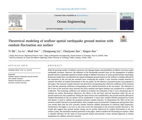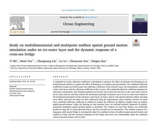2023年,公司“智能防灾”研究团队成员石燚博士等在国际TOP期刊《Ocean Engineering》(中科院SCI一区,近5年影响因子5.2)上接连发表2篇研究论文《Study on multidimensional and multipoint seafloor spatial ground motion simulation under an ice-water layer and the dynamic response of a cross-sea bridge》和《Theoretical modeling of seafloor spatial earthquake ground motion with random fluctuation sea surface》,公司为第一署名单位,石燚博士为论文第一作者,大连理工大学为合作单位。