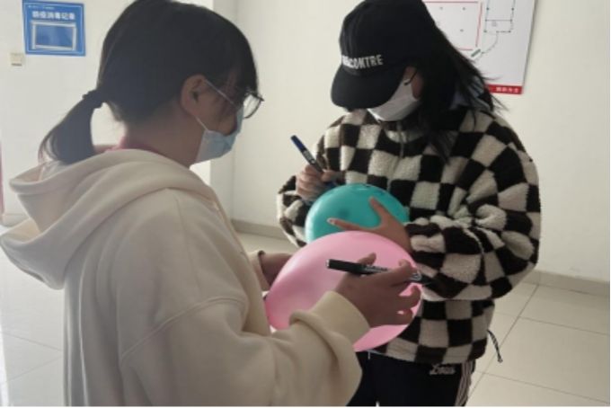 活动中,同学们先吹一个气球,再用彩色画笔在气球上画上笑脸等一切喜欢的事物或想说的话,将过去的烦恼和焦虑留在今天,以更加阳光积极的状态去面对明天。同时,同学们在活动中通过与他人的友好交流,既释怀了曾经,又放松了心情;他们的焦虑也在一定程度上得到了缓解。