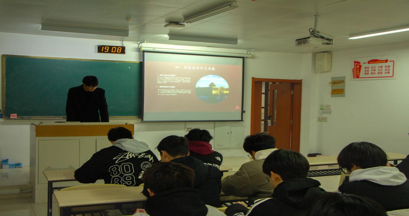 班会活动中,团支书带领班级同学共同学习了周恩来的生平事迹,以及周恩来为新中国的外交贡献,重点学习了周恩来廉洁自律,忠诚担当的精神品质。