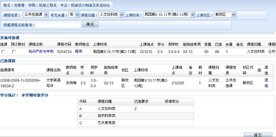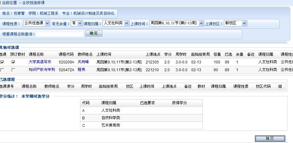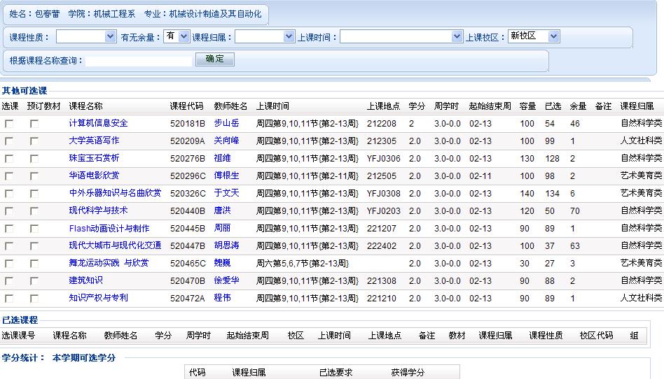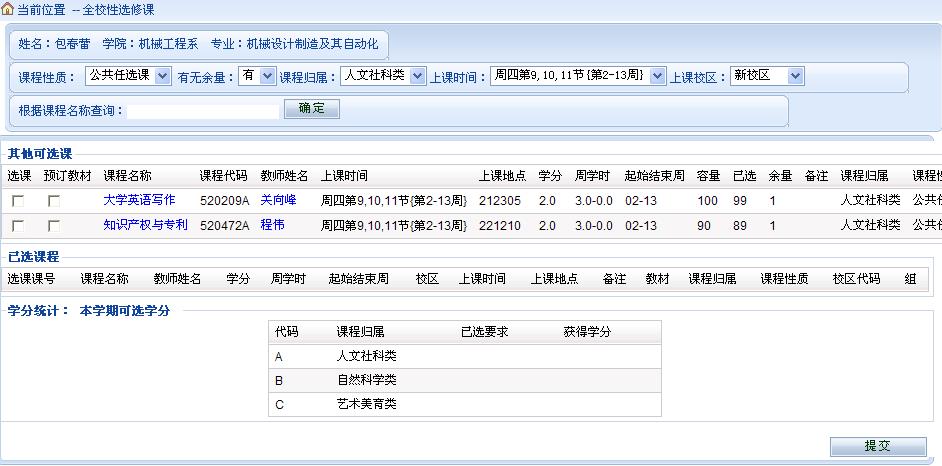 a、进入公共选修课选课界面进行选课,每一门公选课都有各自不同的课程归属,选课时需要特别注意。