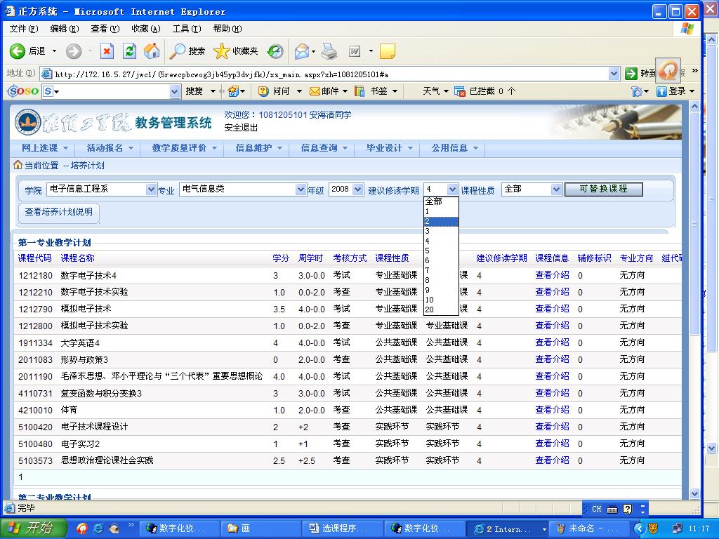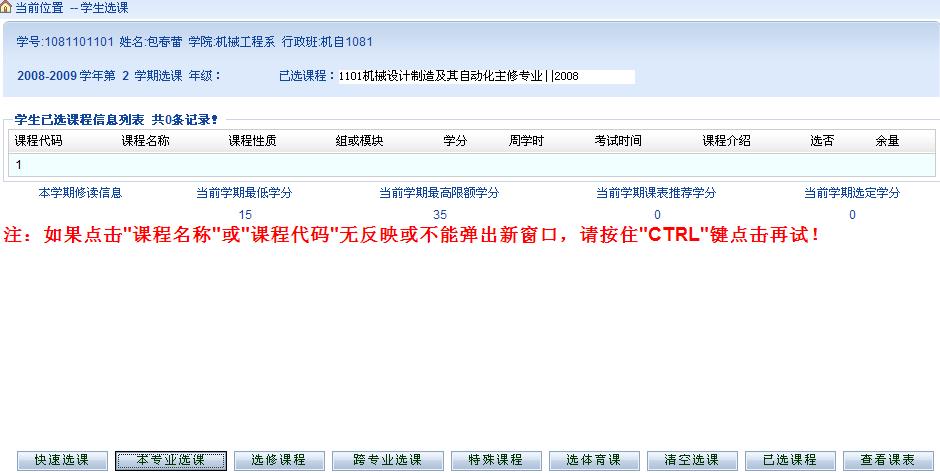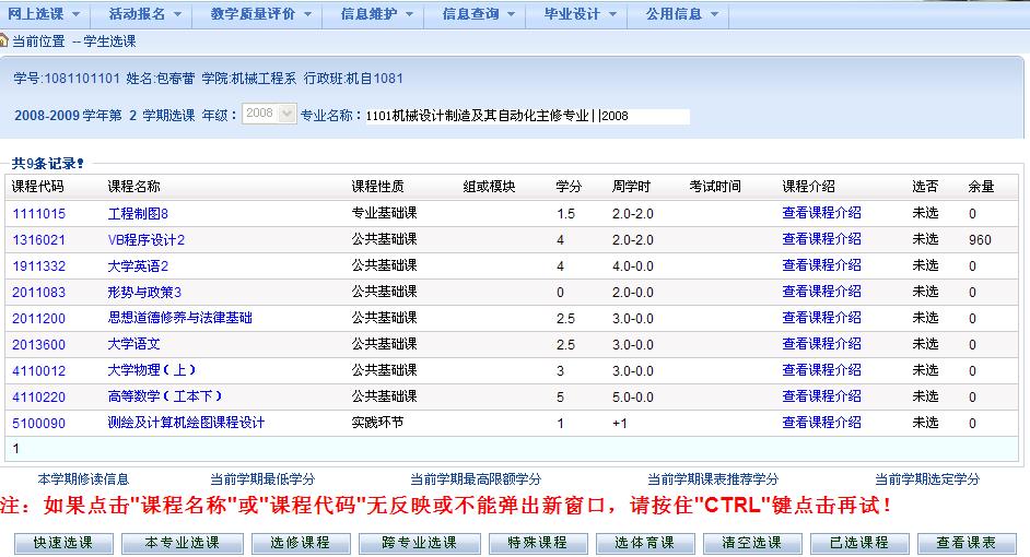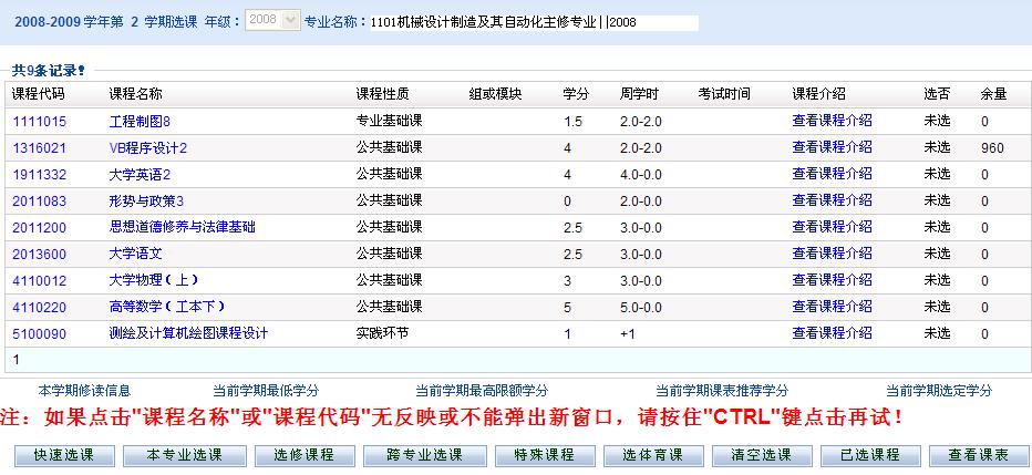 (2)上课时间冲突的课程不能被同时选入,在选课时应优先考虑本专业、本年级的课程,慎重选择。