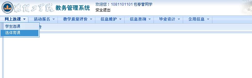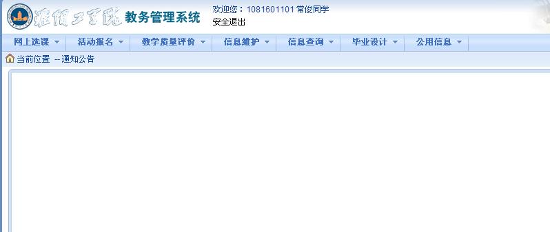 3、如果通过系统认证后,系统会出现下面界面(图1.3),否则请校验用户名和用户口号是否正确输入。有关选课的所有通知都会及时在通知栏里发布,请同学们经常关注。