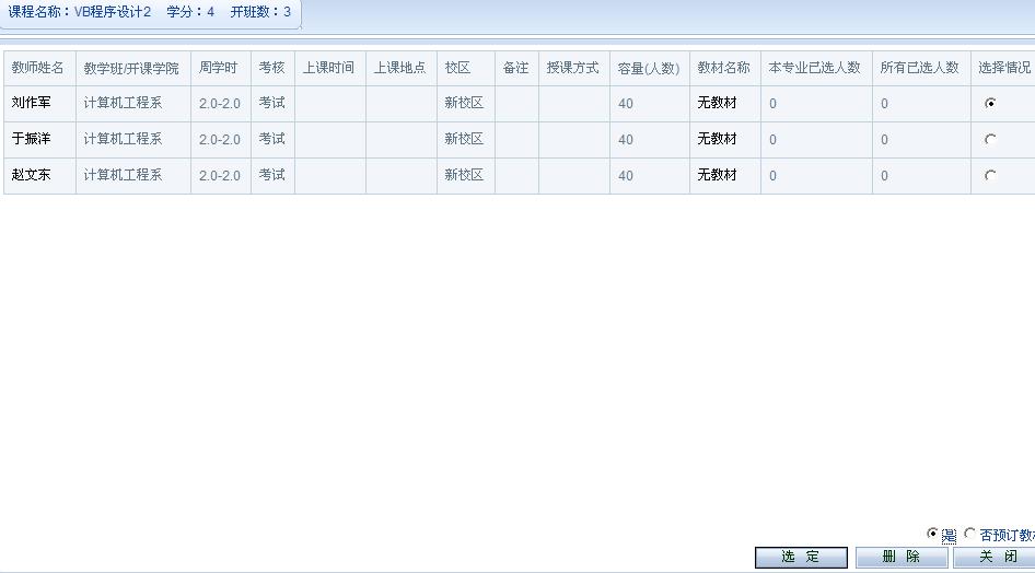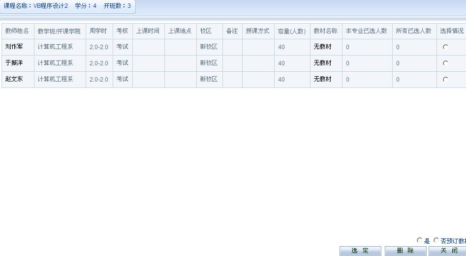在决定选择上课教师后,在与之对应的“选择情况”一栏的单选框中点击选定(图3.13),然后确定是否预订教材,最后点击[选定]按钮确认选课完成。