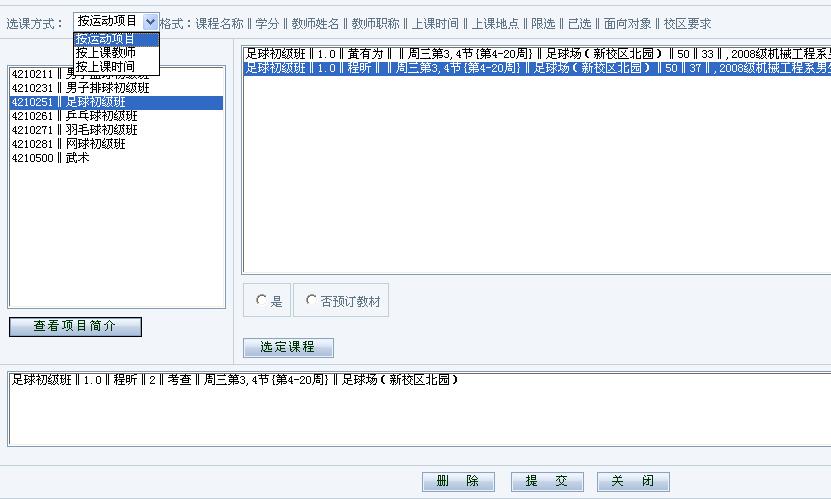 (1)首先确定选课方式,然后选择具体内容。选课方式分为“按运动项目” 、“按上课教师”和 “按上课时间”(图3.8)。
