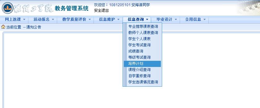 1、查看培养计划。登录教务管理系统,选择“信息查询”->“培养计划”进入培养计划查询界面 (图2.1)。