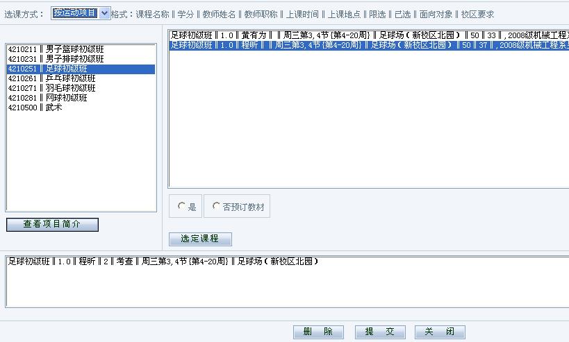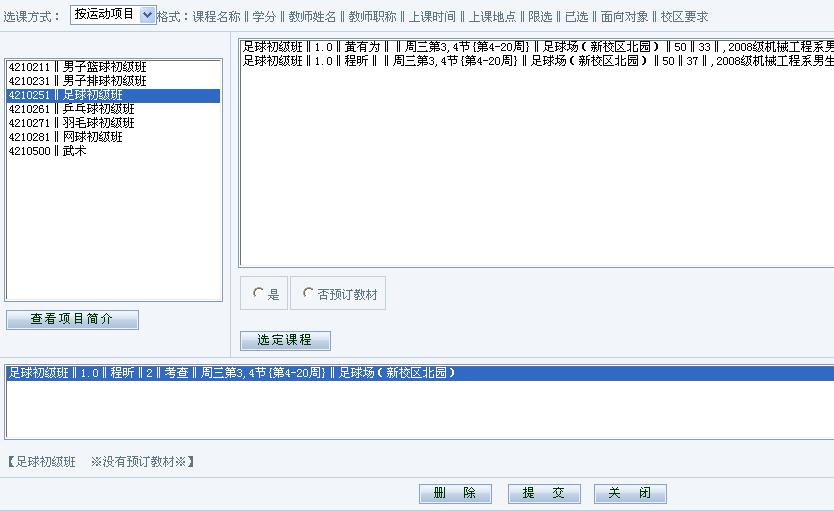 (3)点击选定的体育课后,可以查看是否预订教材。如果想换选,可以点击[删除]按钮删除对该门课程的选择,然后重新选择其他课程,最后点击“提交”按钮确定完成选课(图3.10)。