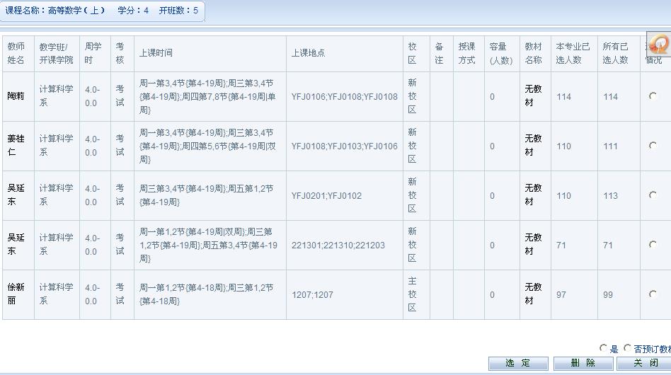 若要删除某门课程的选课结果,需要进入相应课程选课界面(图3.13)点击[删除]按钮以删除已选的这门课程;如想换上课教师或改变预订教材,只需要重新选课,再点击[选定]按钮即可。