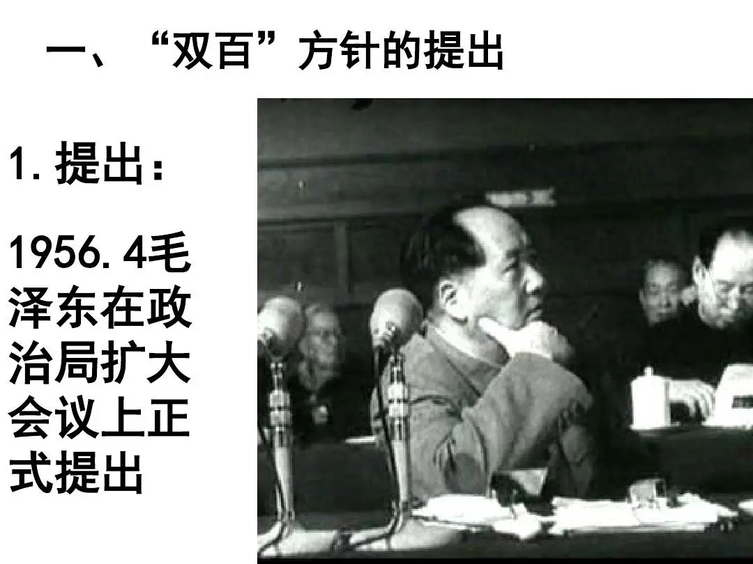 1956年4月28日,毛泽东在中共中央政治局扩大会议上说,艺术问题上的“百花齐放”,学术问题上的“百家争鸣”,应该成为我国发展科学、繁荣文学艺术的方针。5月2日,毛泽东在最高国务会议上正式宣布了“百花齐放、百家争鸣”的方针。5月26日,中央宣传部举行报告会,陆定一作题为《百花齐放,百家争鸣》的讲话,对这个方针作了全面阐述。