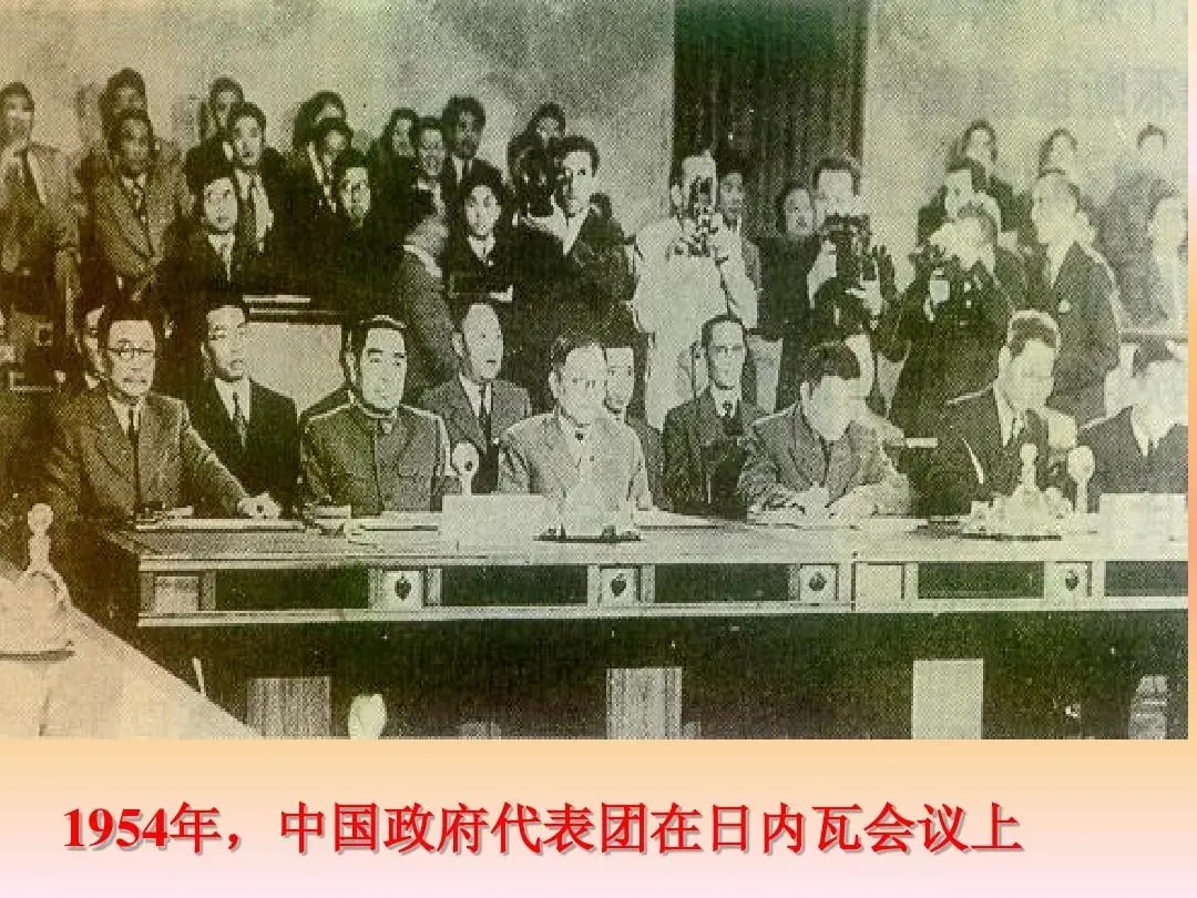 1954年4月26日至7月21日 新中国首次以五大国之一的身份参加讨论和平统一朝鲜问题和恢复印度支那和平问题的日内瓦会议。周恩来率领中国代表团出席。参加日内瓦会议,是中国通过大型国际会议争取和平协商解决重大国际争端的首次尝试和运用多边外交的开端。朝鲜问题由于美国的阻挠未能达成协议。在印度支那问题上,经过中国和除美国外的与会各方的共同努力,最终达成了停战协定。通过这次会议,新中国初步打破美国的孤立和遏制政策,扩大了国际和平统一战线,为国内建设创造了有利的周边环境。