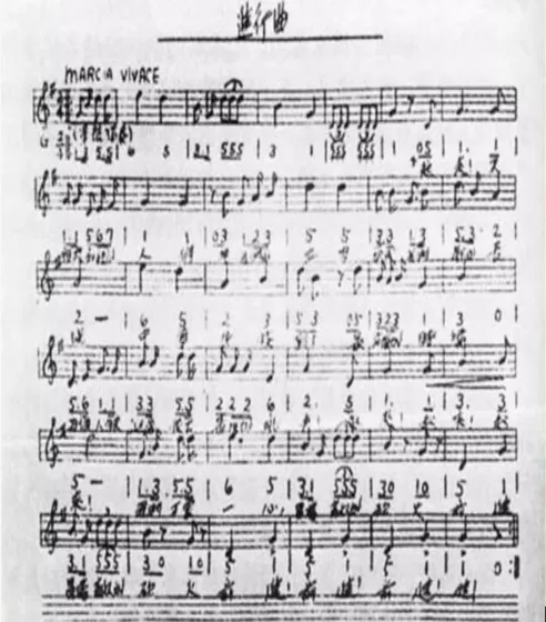 1935年4月,聂耳在日本东京为《风云儿女》主题歌完成了谱曲,并将曲谱寄回国内。原本曲谱的题目只是简单地叫作“进行曲”,电影投资人最终在前面加上了“义勇军”三个字。