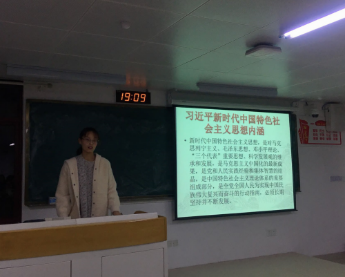 杨钰婷同学带领全体人员学习习近平新时代中国特色社会主义思想内涵,表明新时代思想是马克思主义中国化的最新成果,是党和人民实践经验和集体智慧的结晶,是中国特色社会主义理论体系的重要组成部分,是全党全国人民为实现中华民族伟大复兴而奋斗的行动指南,必须长期坚持并不断发展。