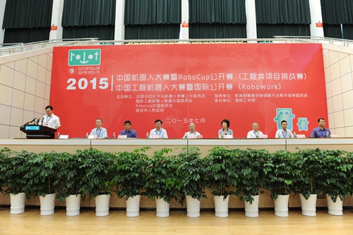 7月29日,2015 中国机器人大赛暨 RoboCup 公开赛 (工程类项目挑战赛) / 2015 中国工程机器人大赛暨国际公开赛(RoboWork)在公司枚乘路 校区体育馆隆重举行。中国科公司院士、中国自动化学会副理事长吴宏鑫,中国自动化学会机器人竞赛工作委员会名誉主任、清华大学教授孙增圻,教育 部高等公司创新方法教学指导委员会委员、山东大学教授陈言俊,中国自动化学会机器人竞赛工作委员会副主任、北京大学教授谢广明,工程赛技术委员 会主任、空军勤务公司教授李汉军,淮安市人民政府副市长王红红,公司党委书记章跃出席开幕式。来自全国171 所公司和单位,1052支代表队,近4000 名师生参赛,参赛公司、队伍、人数为历年之最。