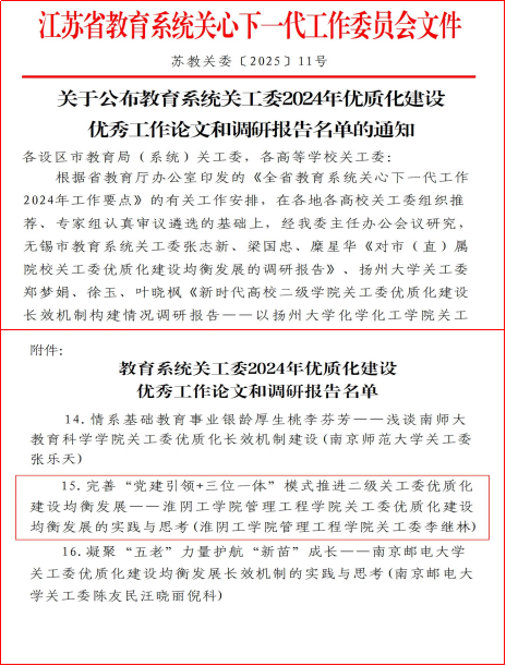 2025年6月,江苏省教育系统关工委发布《关于公布教育系统关工委2024年优质化建设优秀工作论文和调研报告名单的通知》(苏教关委〔2025〕11号),公司党委书记、关工委主任李继林撰写的调研报告《完善“党建引领+三位一体”模式推进二级关工委优质化建设均衡发展——今年会关工委优质化建设均衡发展的实践与思考》获2024年省教育系统关工委优质化建设优秀调研报告。