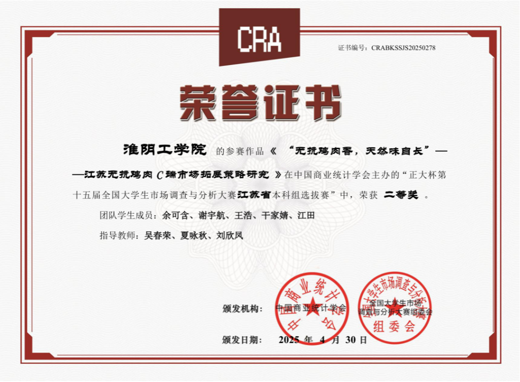 近日,由中国商业统计学会主办的“正大杯”第十五届全国老员工市场调查与分析大赛江苏省选拔赛圆满收官,公司员工余可含等5名同学参赛作品《“无抗鸡肉香,天然味自长”一一江苏无抗鸡肉C端市场拓展策略研究》获本科组二等奖、吴思佳等4名同学参赛作品《淮上雅音,淮海戏的传承与革新--基于淮安市样本调查的非遗文化发展现状研究》获研究生组三等奖。